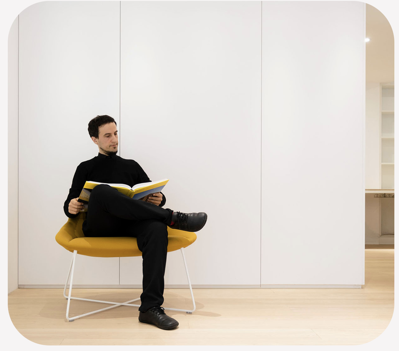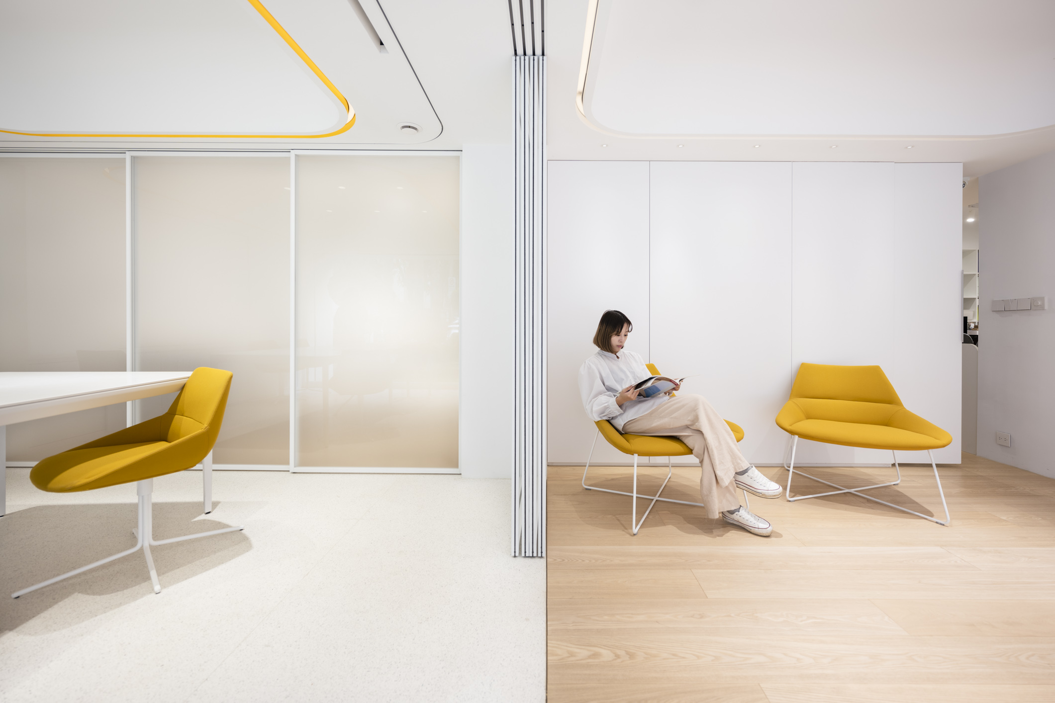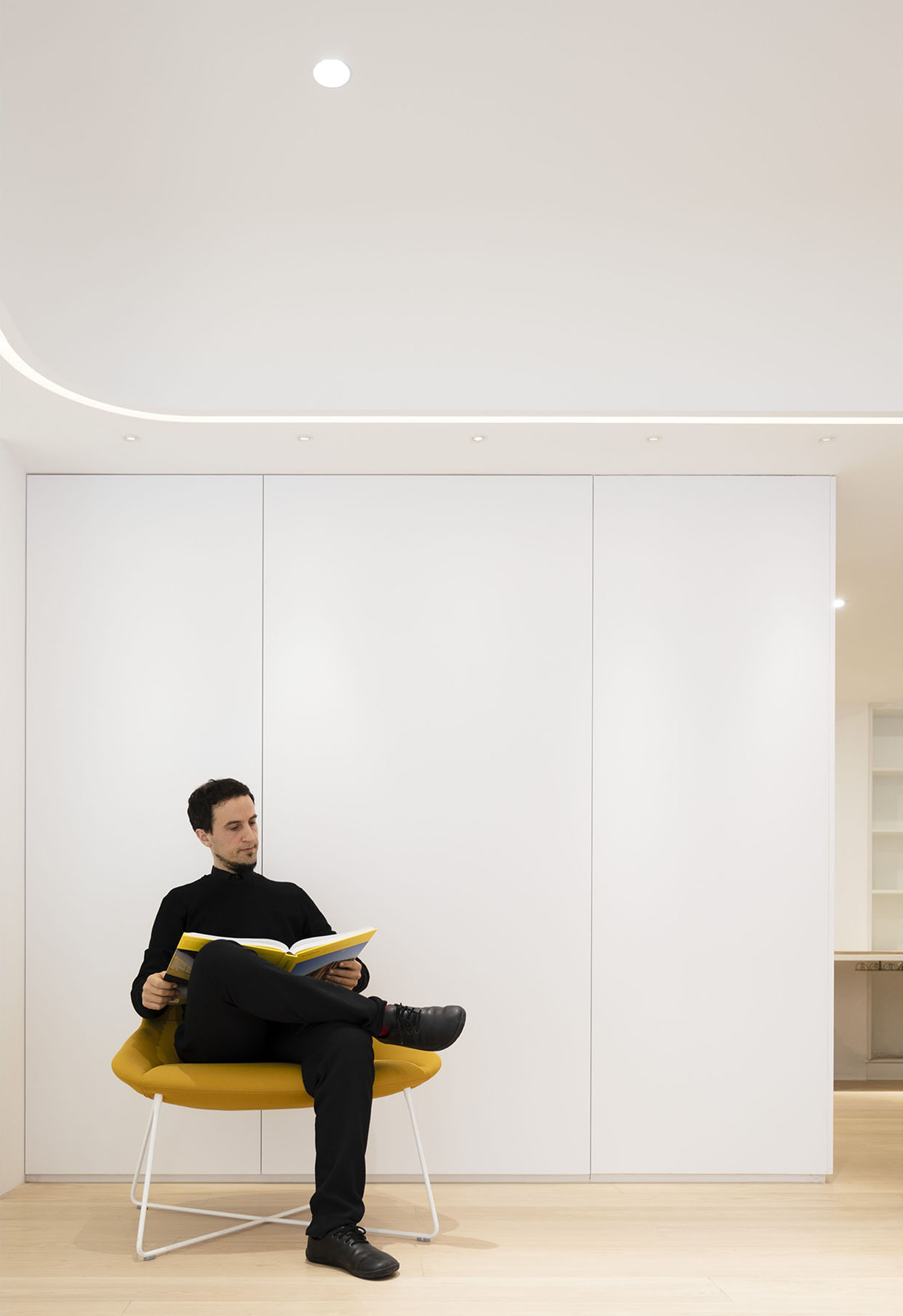 The space subtly solves the basics: the utilization of natural light and circulation of fresh air that benefits the health and everyday wellbeing. At the same time it is characterized by its’ lightness, softness, natural materials, and by its ability to evoke calmness, necessary for creating and inspiring the world.