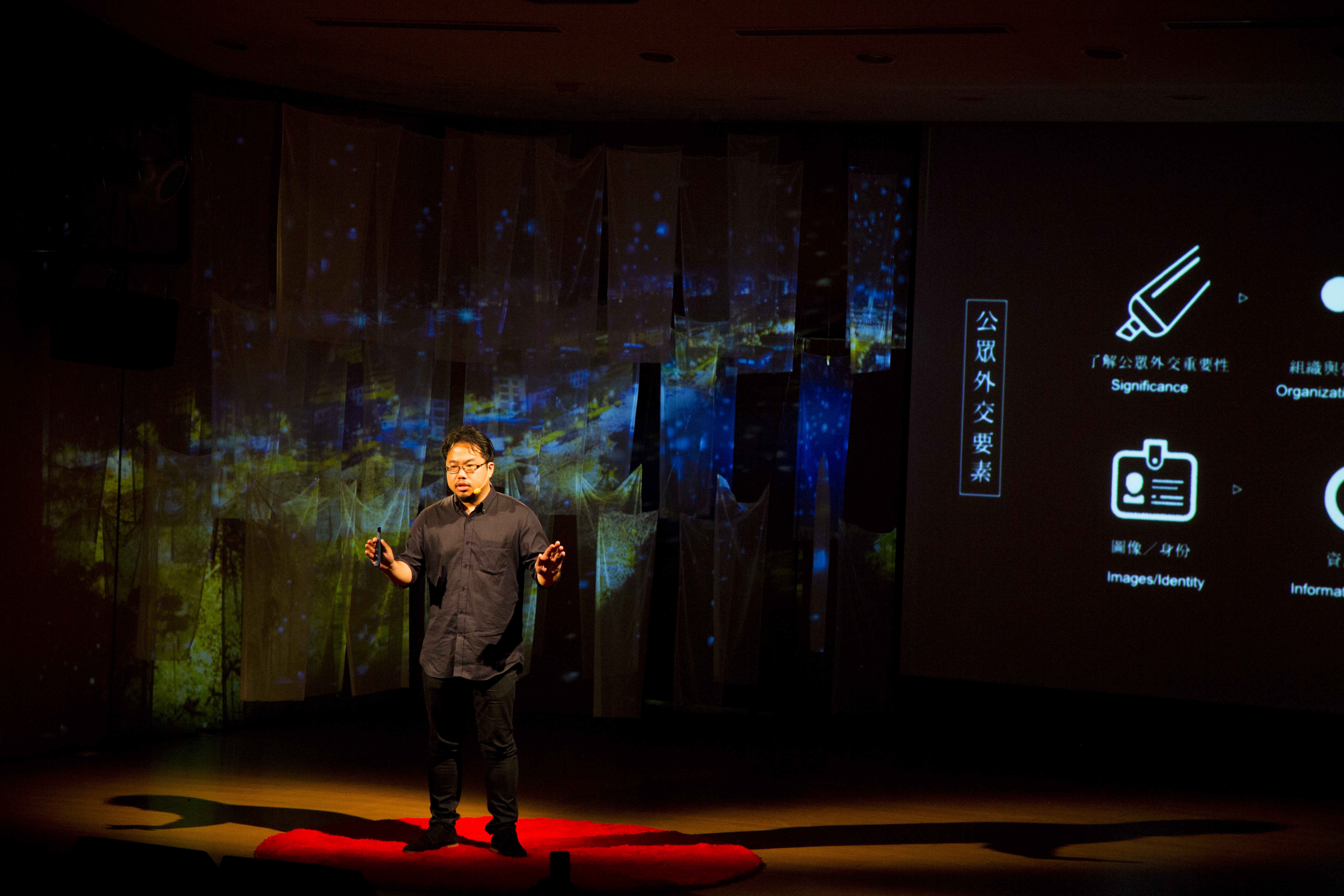 The TEDxTungahiU leit motiv: “Let’s Move Taiwan Forward” was the starting point to rethink the stage design of a TEDx event in the 21st century: An immersive chameleonic scenario evolving with the nature of the speakers theme and complemented with music and visuals creating a unique emotional experience.