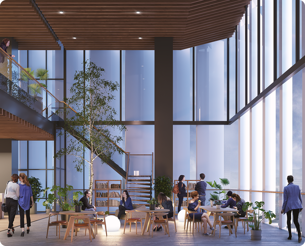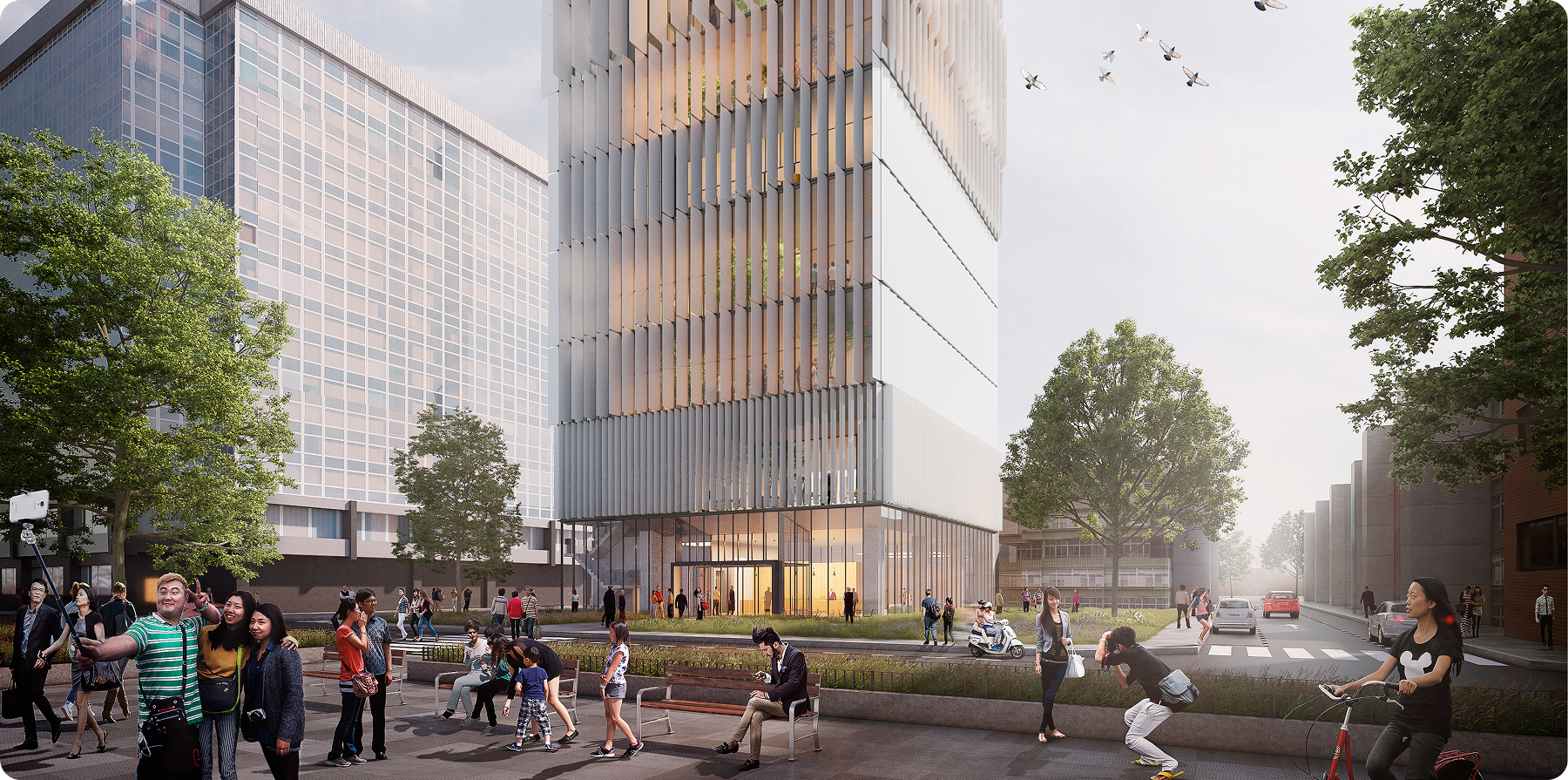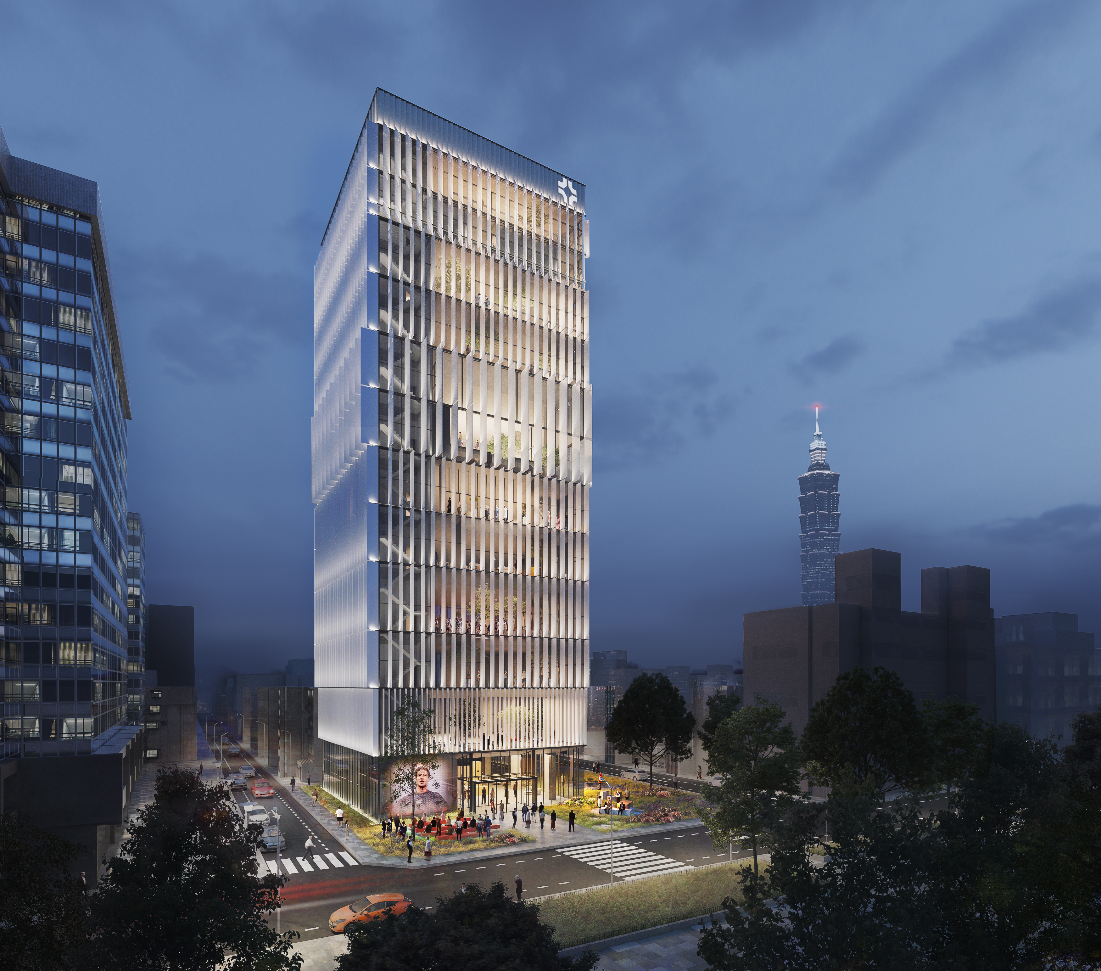 In twilight, the building’s fins illuminate, transforming its appearance into a beacon that sets it apart from its less luminous neighbors. Basking in the gentle glow of the façade is Yuda Tower’s entrance, a design that purposefully draws on a relationship with the adjacent park, extending the public space to invite community and students to mingle in social activity.