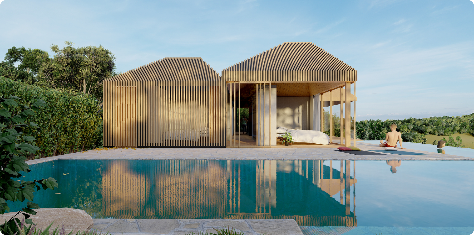 The plan also includes two different working spaces for the Yogi and Archaeologist; a yoga room for practice and an office with sliding glass dividers for added auditory privacy. When rest and retreat is needed, the great room utilizes sliding glass doors that open the interior to create engawa, a space between inside and outside. The bedroom shares this same detail, where the evening landscape can also be enjoyed from over or within the placid reflecting pool that bookends the east most side of the building.