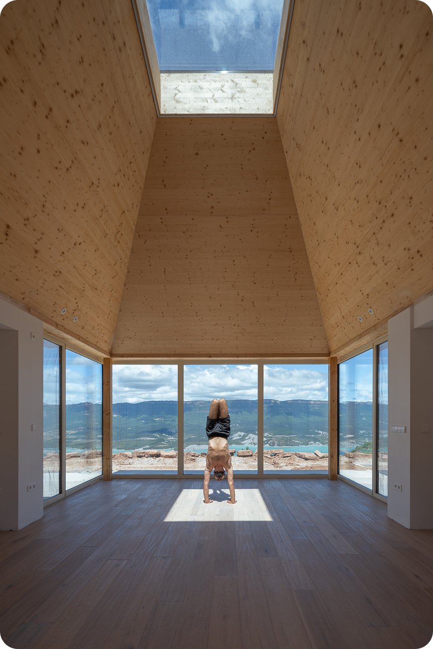 Like the Yogi in contemplation then, the home faces north to bear witness to the majestic Yesa Reservoir and distant blue Pyrenees mountain tops beyond. Old growth trees and strategically placed vegetation in concert with existing natural features envelope the building, providing shelter from cold winter winds and visual privacy from the adjacent Yoga school. The form of the building seeks harmony with these surroundings through a distinctive language of wood clad cone like roof structures that emerge from the mountain side to create a rolling rhythm that echoes the Pyrenees geography.