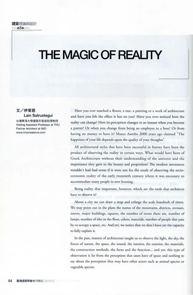 The magazine “Architectural Institute of Taiwan”, in its 80th number, published IMO’s Partner Lain 萊恩 Satrustegui’s article called “The Magic of Reality”.