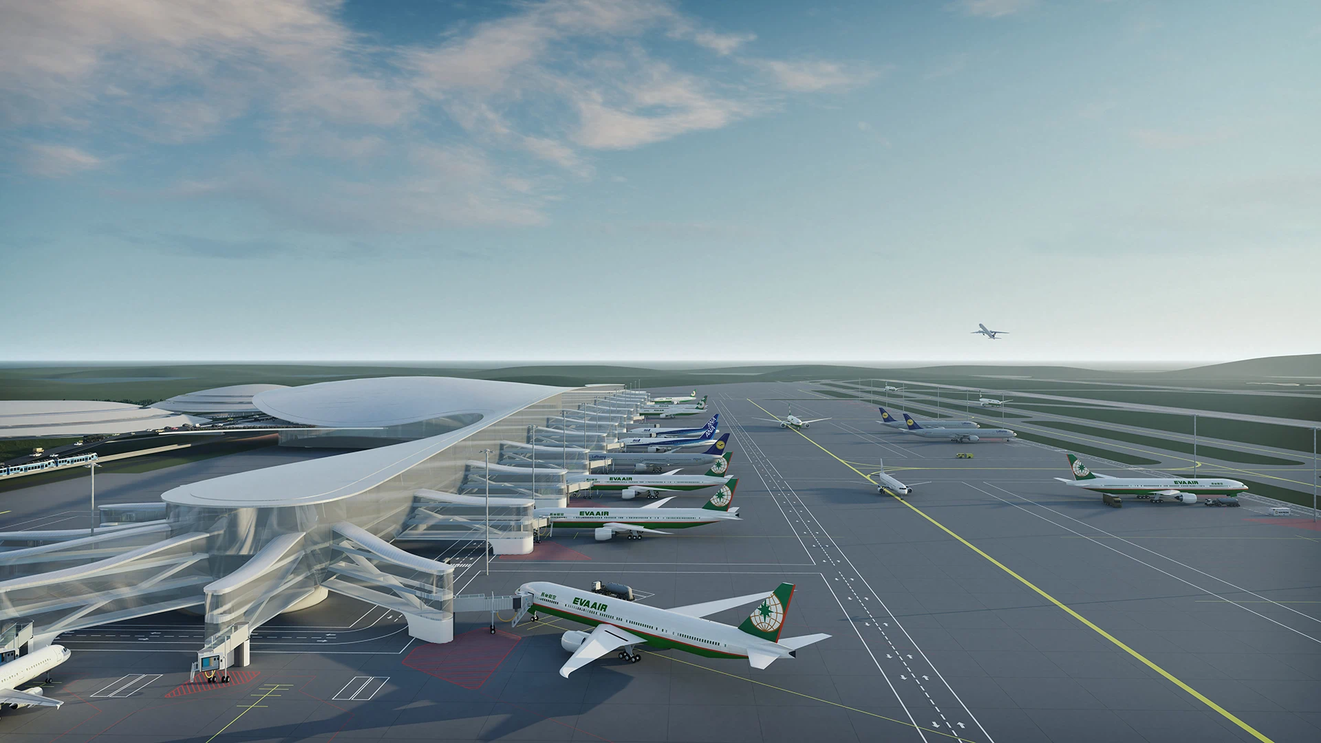 雪山山脈裡富饒的翠綠山谷為肥沃的平原和三角洲增添了盎然生機,一路延伸至大海,成為臺灣人工作與生活的場所。這樣的地理特徵在臺灣的心臟地帶「臺中」最為顯著。臺中國際機場坐落於俯瞰海岸的山丘上,以商業區和工業區環繞四周。總體規劃視覺設計充分融入多元的地理文化,以流暢的曲線融合周遭環境。成功地創造出專屬於這個區域的獨特體驗,使機場、工業區和臺中市區都獲益匪良多。